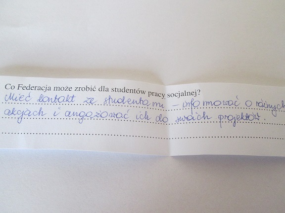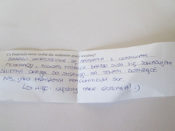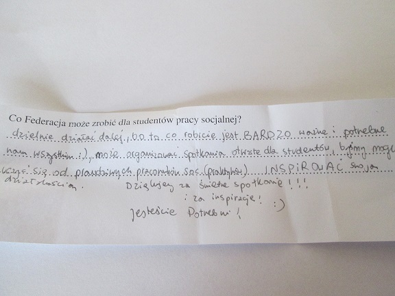 Przedstawiciel Federacji w ramach otwartego konwersatorium, głównie dedykowanego dla studentów I i II roku pracy socjalnej w Instytucie Socjologii UJ - poprowadził warsztat dotyczący organizowania się środowiska zawodowego pracowników socjalnych, idei powołania Federacji, uzwiązkowienia, a także oczekiwanych przez studentów zmian zarówno w samym zawodzie, pracy socjalnej, jak i w systemie pomocy społecznej. Otwarta dyskusja dotyczyła warunków pracy i świadczenia pracy socjalnej, a także metod dochodzenia do postulowanych zmian. Po raz kolejny środowisko studenckie silnie zaznaczyło oczekiwania związane z odbiurokratyzowaniem pomocy, rozdziałem pracy socjalnej od postępowań administracyjnych, zapewnieniem bezpieczeństwa pracownikom socjalnym, budowaniem pozytywnego wizerunku pracowników socjalnych w mediach oraz właściwych warunków płacowych.