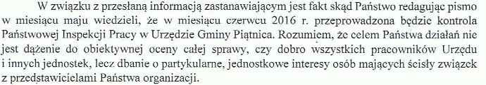 Wójt Piątnicy po tym jak Federacja postanowiła bronić praw i interesów zwolnionego kierownika, od początku usiłował przekonać naszą organizację by ta odstąpiła od statutowych i ustawowych działań m.in. poprzez odroczenie obrony zwolnionego pracownika, a także sugerując konsekwencje prawne. Włodarz Piątnicy nie omieszkał nawet zaapelować do Federacji o powstrzymanie się od wystąpień z zapytaniami publicznymi, gdyż te mogą rzekomo dezorganizować jego pracę i świadczą o nękaniu jego urzędu, choć rzeczowych argumentów na dowód prześladowania nie podaje.