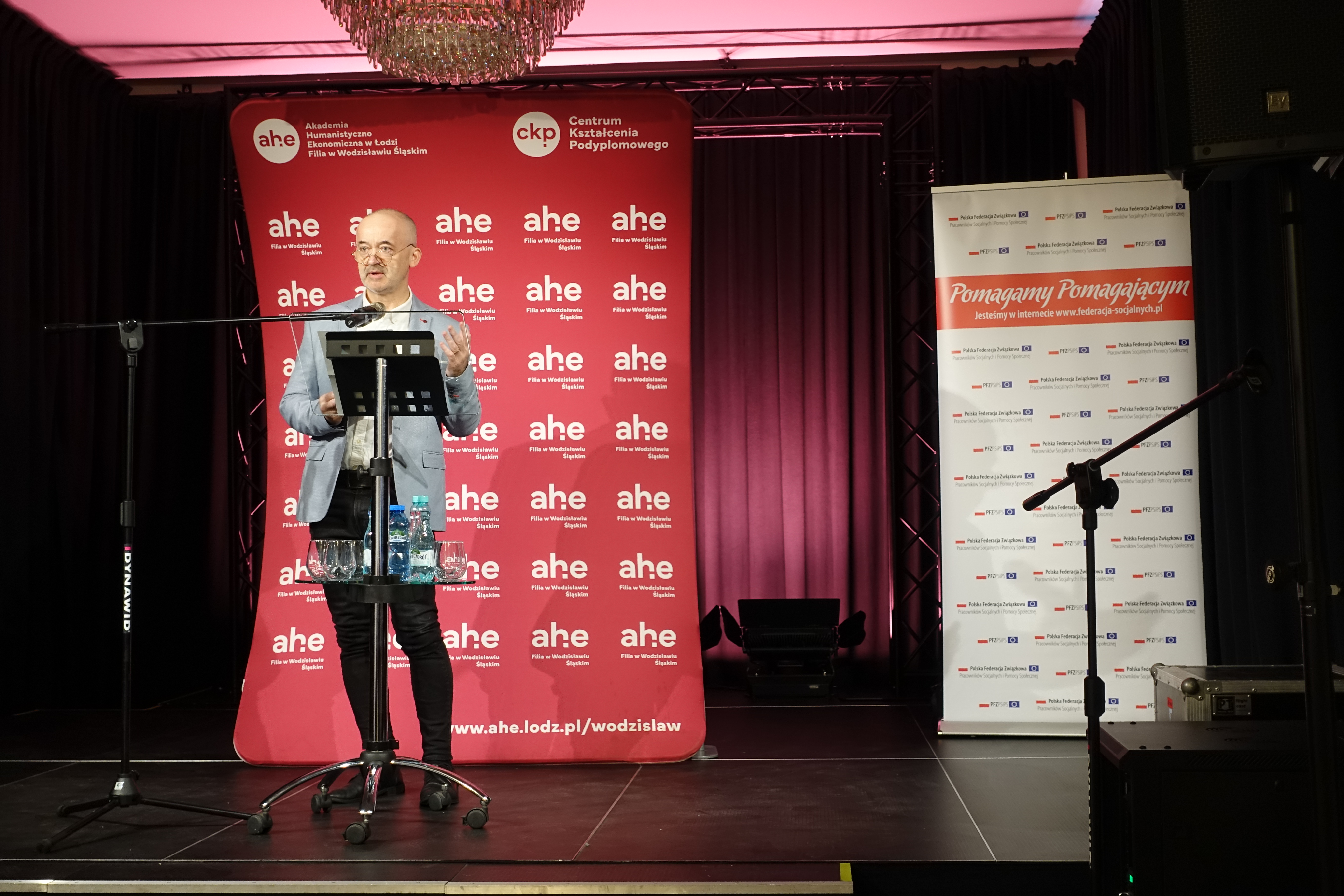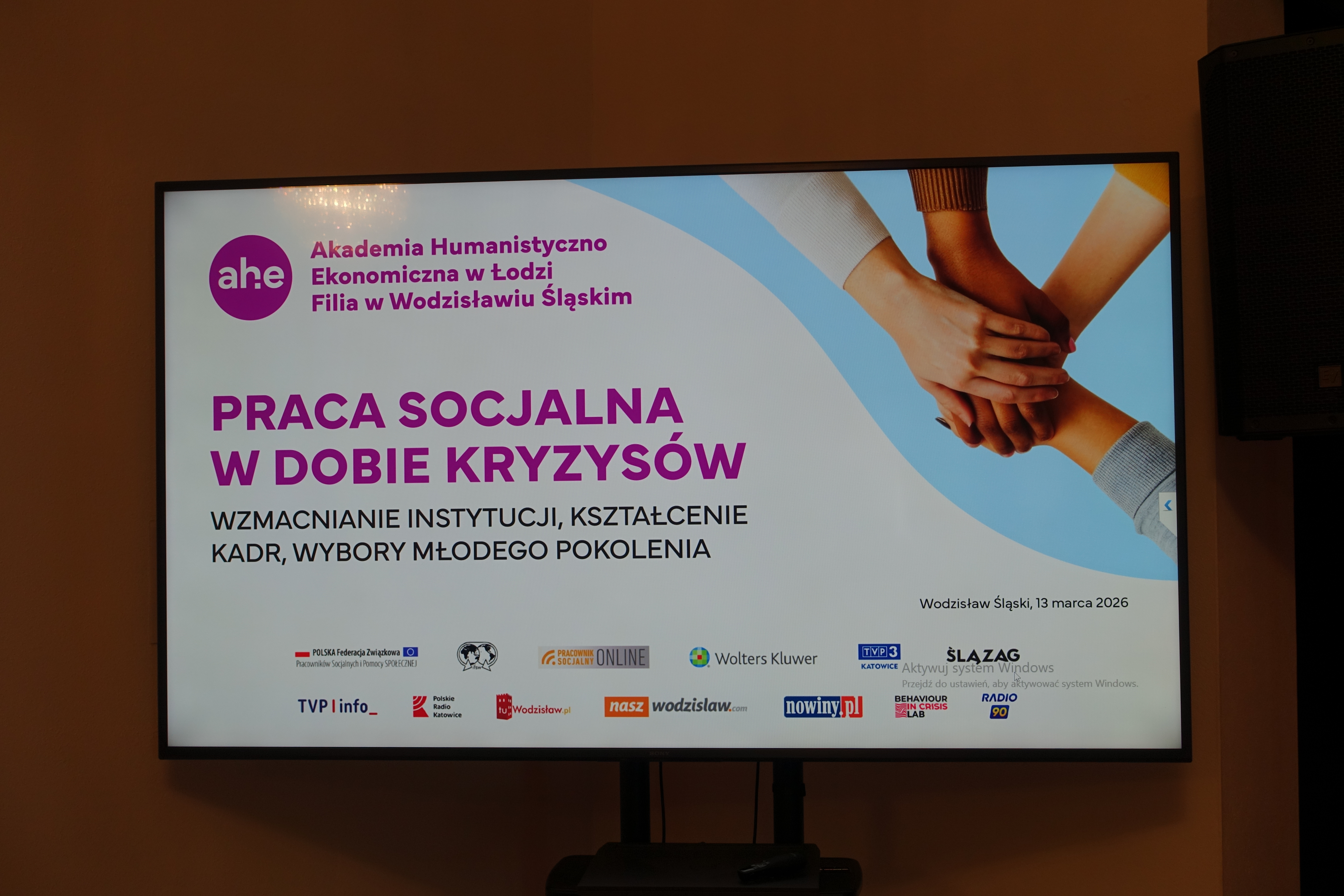 Ponad 200 uczestników wzięło udział w zorganizowanej 13 marca 2026 r. w Wodzisławiu Śląskim – konferencji pt. „Praca socjalna w dobie kryzysów - wzmacnianie instytucji, kształcenie kadr, wybory młodego pokolenia”, zorganizowanej przez Akademię Humanistyczno-Ekonomiczną w Łodzi, Filia w Wodzisławiu Śląskim i przy współpracy m.in. z naszą Federacją w ramach obchodów Światowego Dnia Pracy Socjalnej (WSWD).