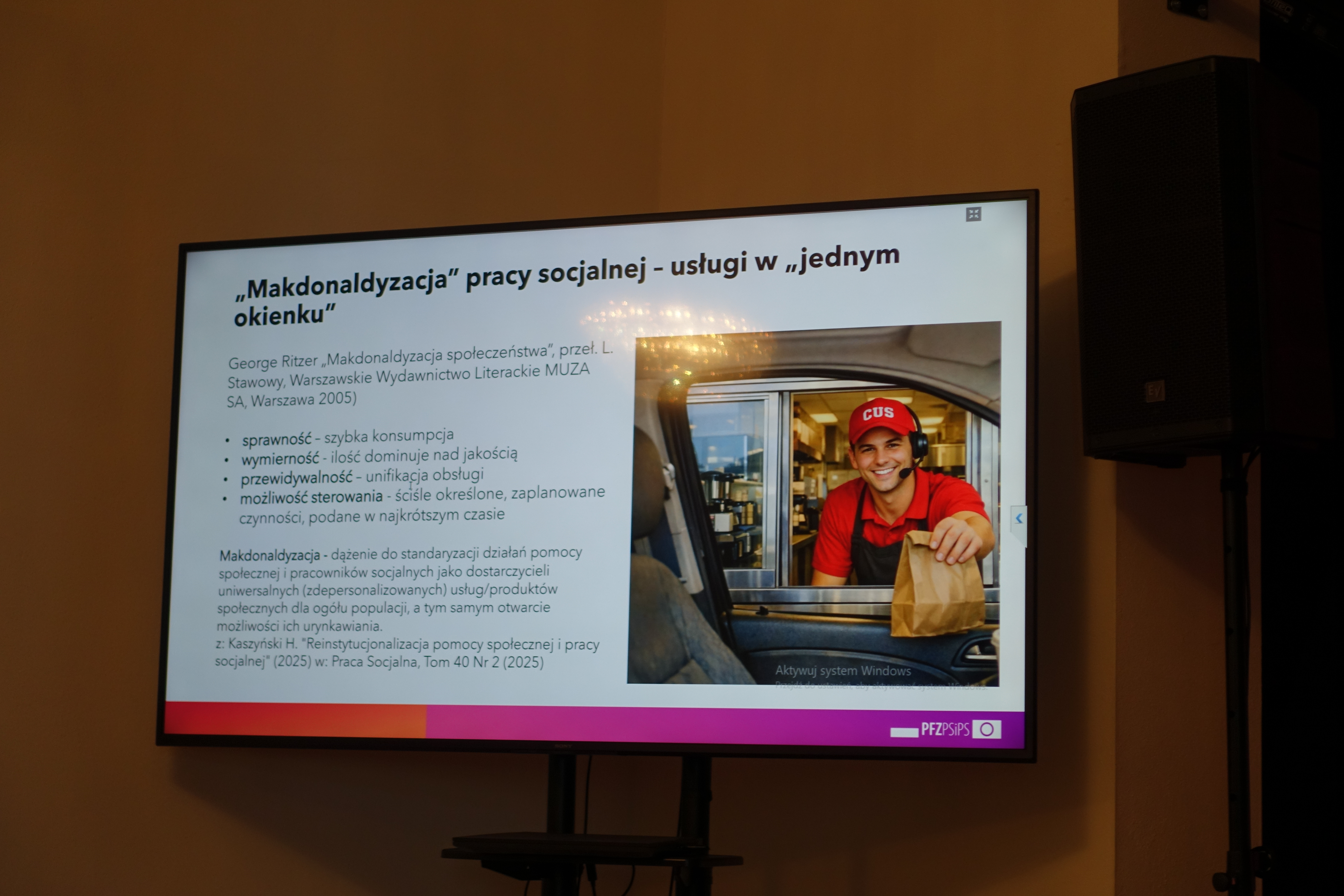 Paweł Maczyński – przewodniczący PFZPSiPS, przedstawił praktyczne implikacje dla procesów makdonaldyzacji pracy socjalnej w Polsce i wskazał, że to właśnie fasadowo i doraźnie wprowadzane usługi społeczne oraz deinstytucjonalizacja (DI), stanowią dziś zagrożenie dla profesji oraz pomocy dla osób doświadczających marginalizacji.