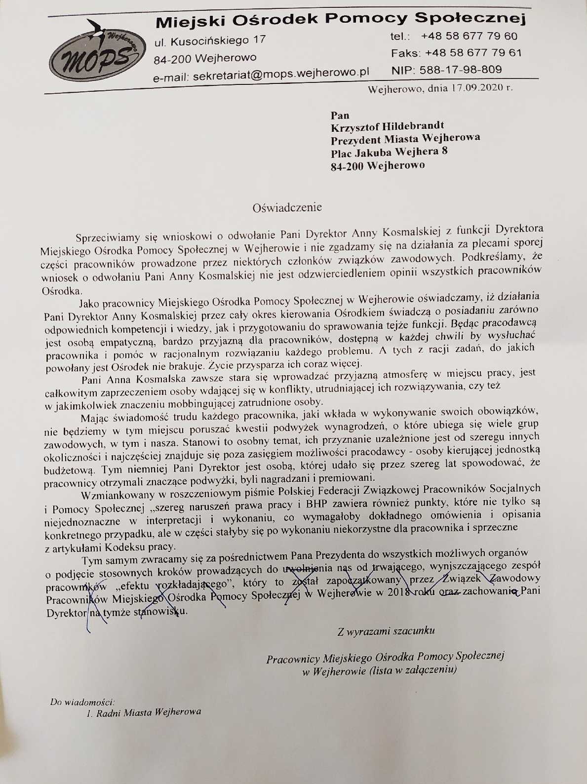 Nie inaczej jest w Wejherowie, gdzie po bezprawnym zwolnieniu przewodniczącego lokalnej organizacji Federacji i zawiadomieniu organów ścigania oraz wymiaru sprawiedliwości przez PIP – część pracowników „spontanicznie” postanowiła poprzeć dyrekcję MOPS. Nowością zasługującą na podkreślenie jest fakt, iż pismo popierające przygotowano na firmowym papierze Ośrodka, co zawsze wymaga zgody, a pod listem podpisali się także przedstawiciele związku z dopiskiem o wywieranej presji. Niewątpliwie świadczyć to może o „niezależności” całej inicjatywy.