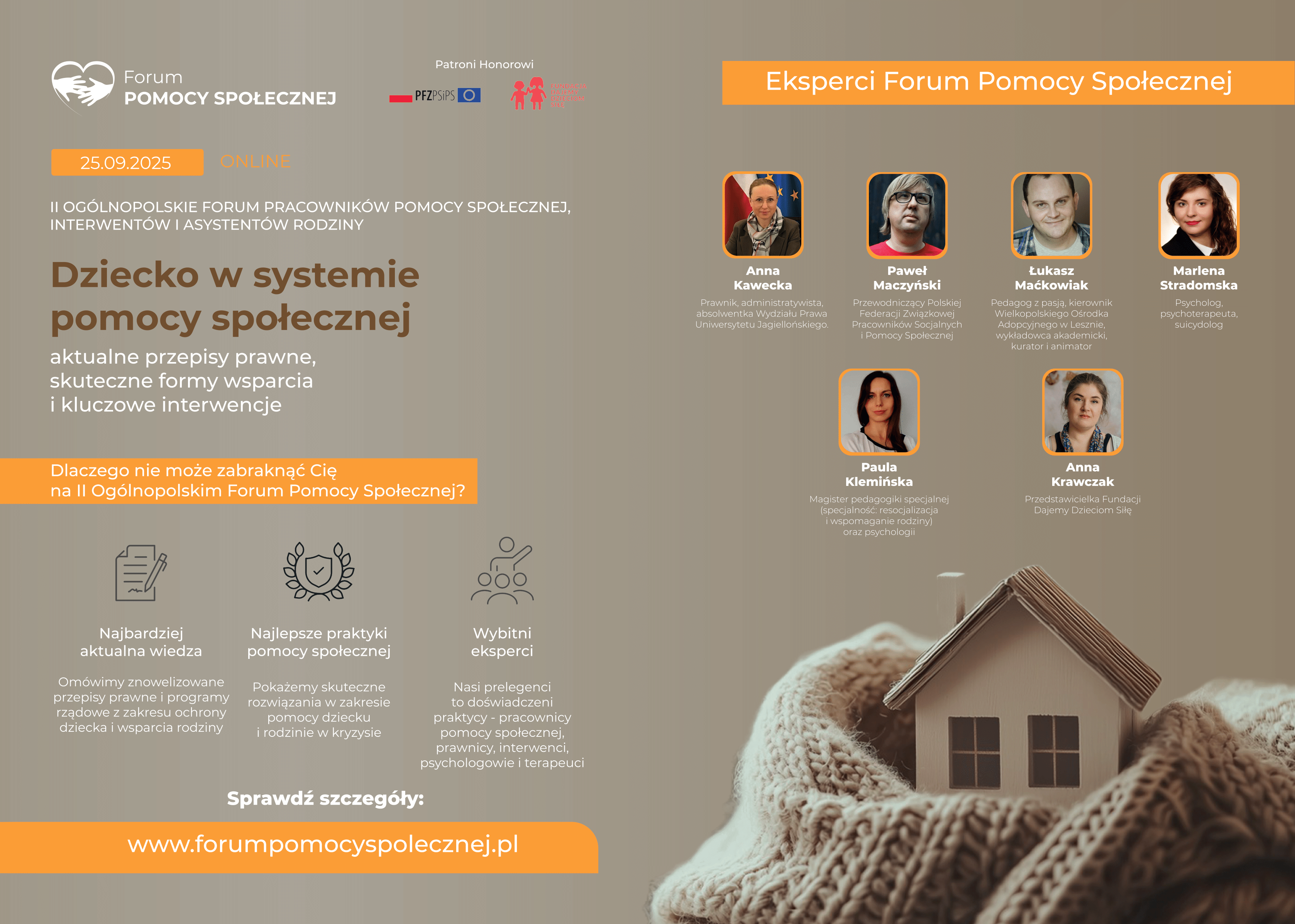 Już 25 września 2025 r. zapraszamy na wyjątkowe wydarzenie, które dostarczy najbardziej aktualnej wiedzy i skutecznych rozwiązań w zakresie wsparcia dziecka i rodziny w kryzysie. Z wielką przyjemnością informujemy, że Federacja wraz z Fundacją Dajemy Dzieciom Siłę objęła patronatem Forum, a jednym z prelegentów konferencji będzie Paweł Maczyński, Przewodniczący Federacji. Szczegóły i zapisy na stronie - www.fmp.pl/forumpomocyspolecznej Dołącz i poszerzaj swoje kompetencje w pracy socjalnej, interwencji i asystenturze rodziny.