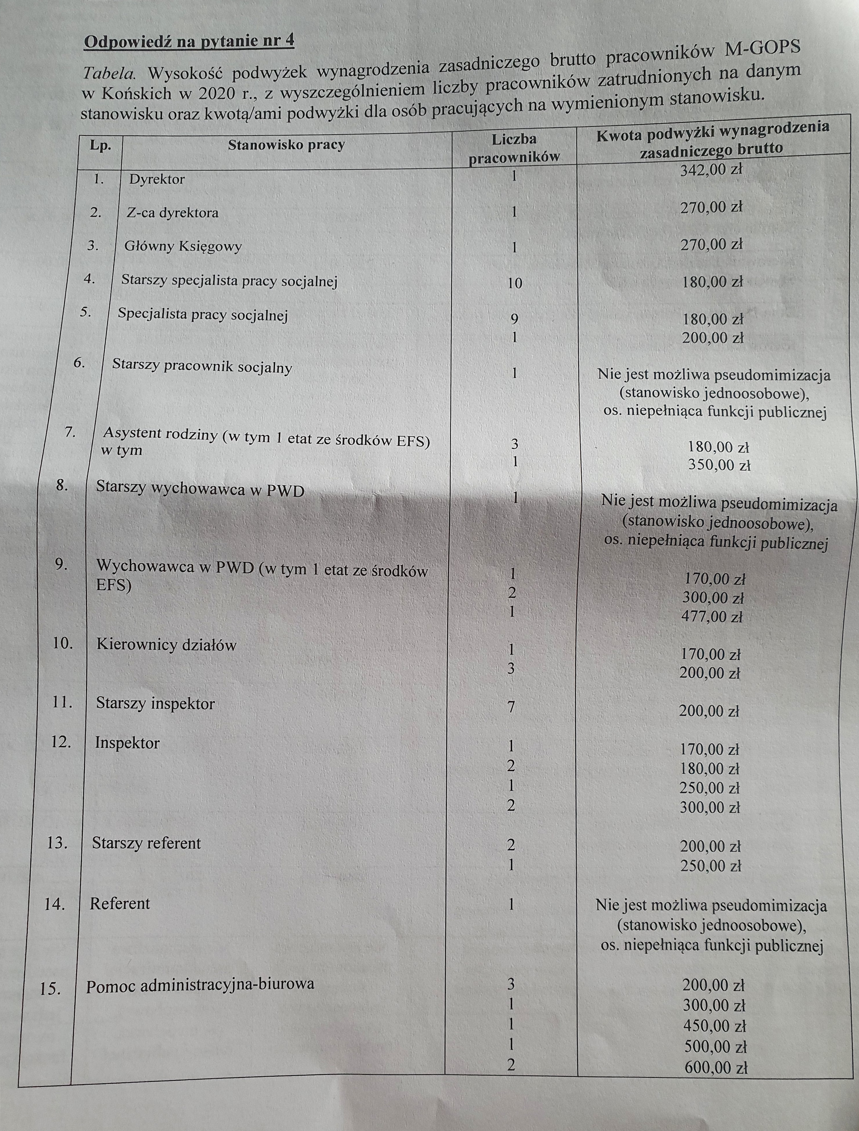 Już w trakcie sporu, który trwa od 2019 r., w styczniu 2020 r. w ośrodku nastąpiły regulacje płac. Wydawać się mogło (i takie jest stanowisko organizacji związkowej), że skoro ok. 50% pracowników zarabia na poziomie płacy minimalnej - to właśnie te osoby najsłabiej zarabiające lub wszyscy pracownicy powinni otrzymać najwyższe lub jednakowe podwyżki. Tymczasem, jak wynika z upublicznionych przez pracodawcę na nasz wniosek, cząstkowych danych (o całość danych przyjdzie zapewne powalczyć w sądzie administracyjnym) - oprócz kilku wyjątków, jedne z wyższych podwyżek otrzymała sama dyrektor, jej zastępczyni, księgowa i pracownicy administracji. Należy bowiem przypuszczać, że nawet część z podwyżek wyższych niż przyznane dyrekcji, wiązała się zapewne z koniecznością ustawowego wyrówania płac do wynagrodzenia minimalnego dla najsłabiej zarabiających (płaca minimalna wzrosła w 2020 r. do 2600 zł). To dodatkowy argument, by wzmocnić akcję protestacyjną i by wizerunek pracodawcy był budowany na sprawiedliwych podwyżkach dla ogółu zatrudnionych.