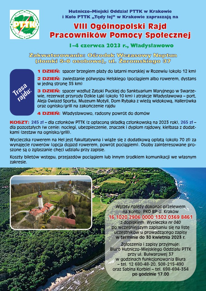 Już po raz ósmy nasza federacyjna przyjaciółka i była sekretarz – Sabina Korbiel organizuje wraz z Kołem PTTK w Krakowie - ogólnopolski Rajd Pracowników Pomocy Społecznej. Tym razem spotkamy się na szlaku w okolicach Władysławowa. Można jeszcze zapewnić sobie udział w tym wyjątkowym wydarzeniu. Szczegóły dotyczące zgłoszeń i samego Rajdu dostępne są w dalszej części artykułu.