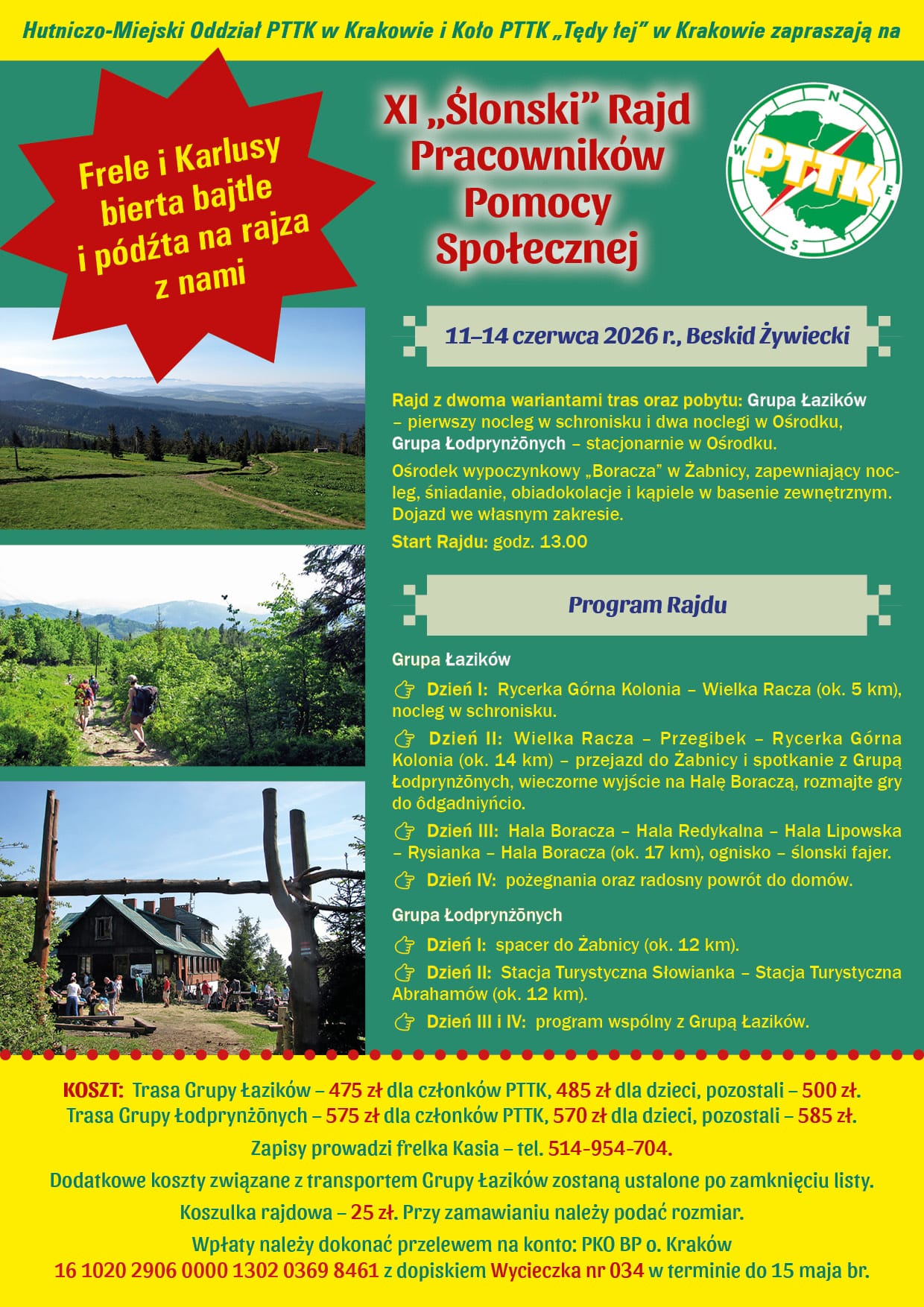 To już po raz jedenasty pracownicy pomocy społecznej spotkają się, by wspólnie wędrować i spędzać czas w malowniczych regionach naszego kraju. Tym razem będzie to Ślonski Rajd "Frele i Karlusy bierta bajtle i pódźta na rajza z nami", który odbędzie się w dniach 11-14 czerwca 2026 roku, i organizowany, jak sama nazwa wskazuje, przez naszą rajdową grupę śląską, pod szyldem Koła PTTK Tędy łej z Krakowa, w tym przez naszą przyjaciółkę - Sabinę Korbiel.