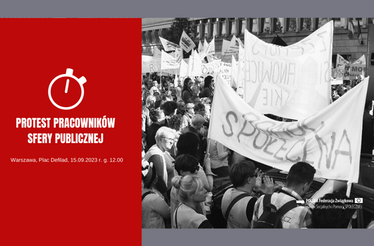 Zgodnie z decyzją Zarządu Federacji, nasza organizacja dołącza do Protestu Pracowników Sfery Publicznej, organizowanego w dniu 15.09.2023 r. w Warszawie o godzinie 12.00. Zapraszamy i zachęcamy Wszystkich Pracowników Pomocy Społecznej do jak najliczniejszego udziału w manifestacji, której żądania pozostają zbieżne z postulatami naszego środowiska zawodowego. Chcemy wspólnie zamanifestować niezadowolenie wynikające z postawy rządzących i resortu rodziny wobec wieloletnich zaniedbań w zakresie poprawy warunków naszego wynagradzania i pracy oraz w całym obszarze świadczenia pomocy.