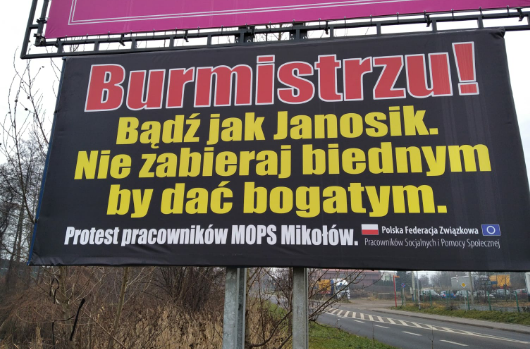 Takie wezwanie pojawiło się na protestacyjnym billboardzie, który został umieszczony przy jednej z tras w Mikołowie. To nawiązanie do trwającego sporu zbiorowego o podwyżki w MOPS, ale także do naszych ustaleń, z których wynika, że ośrodek w ostatnich latach regularnie zwracał do budżetu miasta znacznej wysokości środki, które mogłyby posłużyć wzrostowi uposażeń samych pracowników pomocy społecznej. Protest trwa i wszystko wskazuje, że będzie eskalował także w następnych miesiącach.
