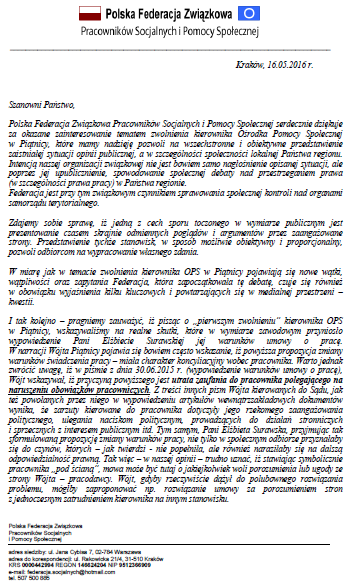 W związku z wydarzeniami w Piątnicy, gdzie Federacja podjęła się obrony praw i interesów zwolnionego kierownika OPS – Zarząd PFZPSiPS postanowił wydać oświadczenie dla mediów.