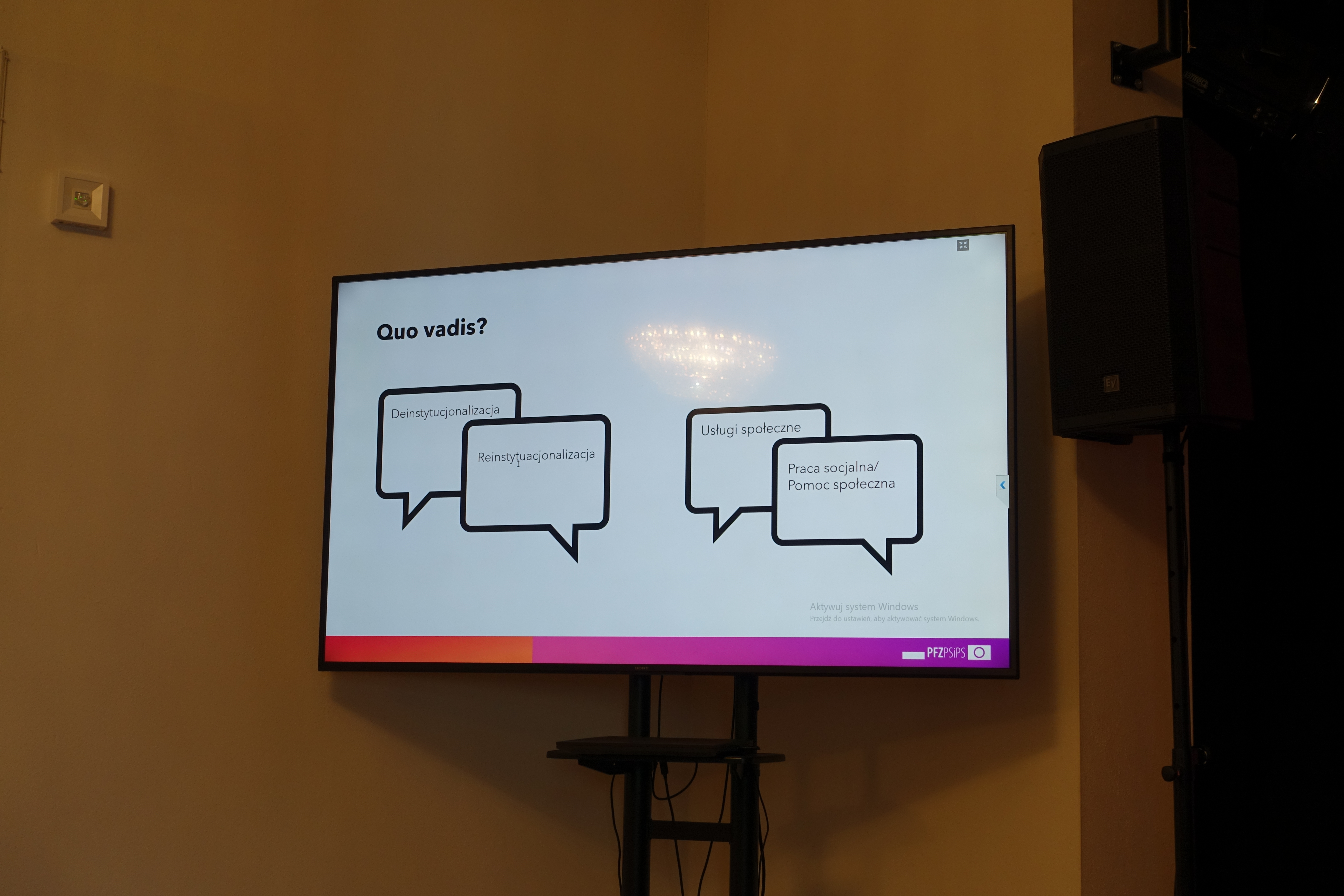 Paweł Maczyński – przewodniczący PFZPSiPS, przedstawił praktyczne implikacje dla procesów makdonaldyzacji pracy socjalnej w Polsce i wskazał, że to właśnie fasadowo i doraźnie wprowadzane usługi społeczne oraz deinstytucjonalizacja (DI), stanowią dziś zagrożenie dla profesji oraz pomocy dla osób doświadczających marginalizacji.