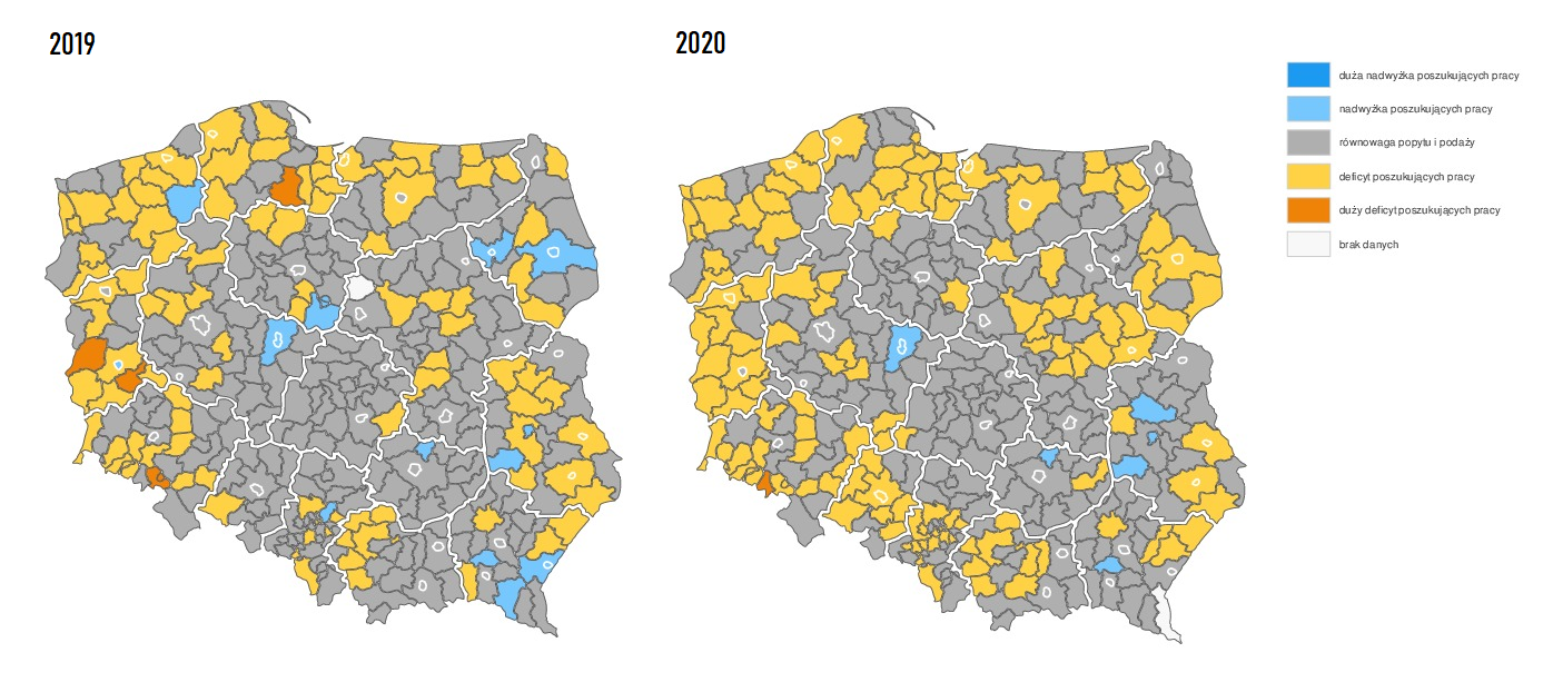 Jak wynika z powyższego zestawienia - w porównaniu z 2019 r. - w 2020 r. wzrosła liczba powiatów i województw, w których zapotrzebowanie na zatrudnienie pracowników socjalnych przewyższa liczbę chętnych do podjęcia tej pracy. Niewiele jest natomiast takich powiatów, w których istnieje nadwyżka poszukujących pracy na ww. stanowisko w stosunku do wolnych etatów. Miejsc z deficytem pracowników socjalnych więc przybywa, o czym wielokrotnie informowaliśmy, wskazując m.in. że w 2018 r. liczba zatrudnionych w zawodzie osiągnęła dawno nie notowany niski poziom z 2012 i 2015 roku.