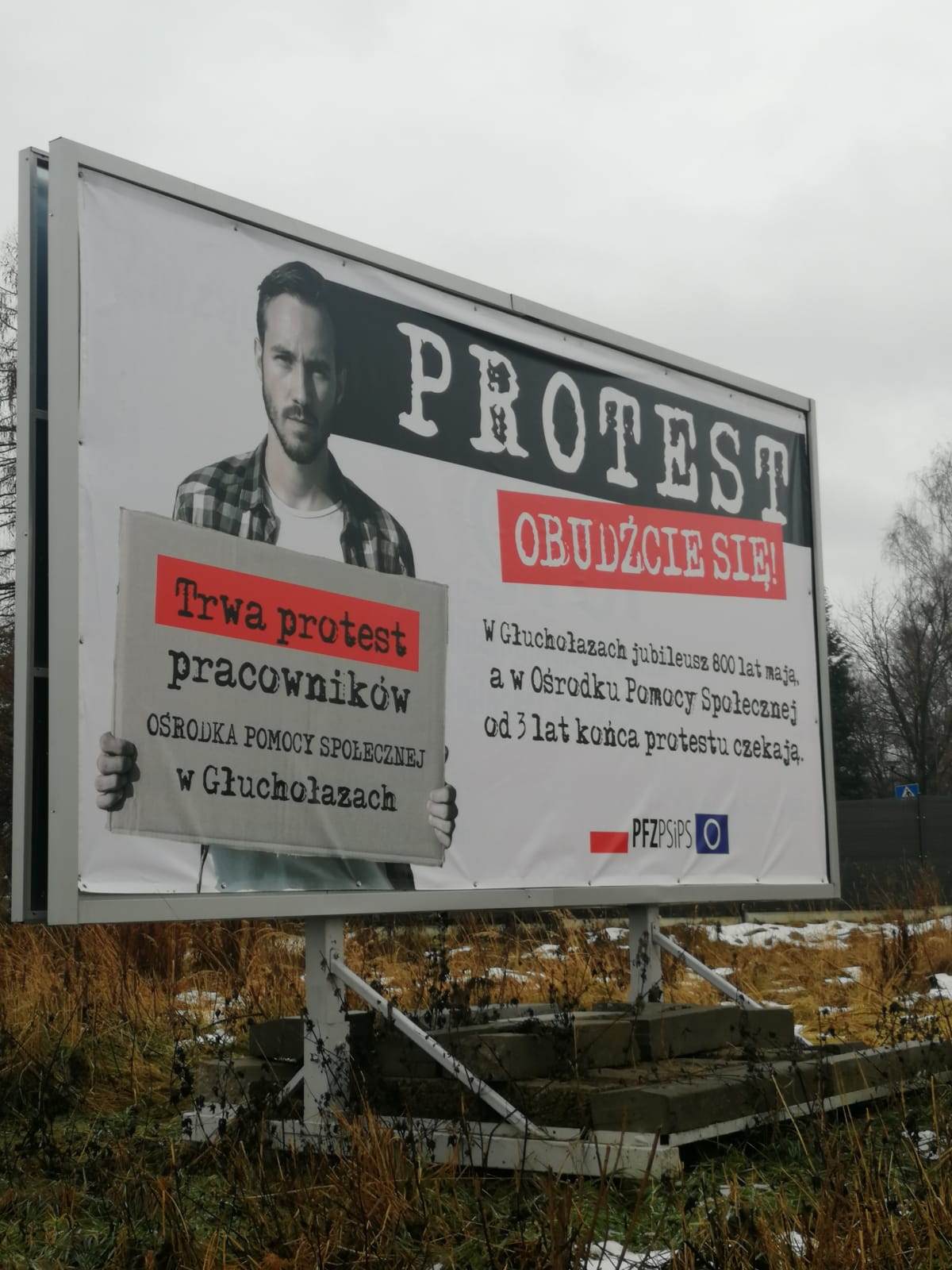 Jak obiecaliśmy – na obchody 800-lecia Głuchołaz, przyjeżdzających do miasta wita nowy billboard nawiązujący do jubileuszu oraz trwającego od 3 lat protestu w miejscowym OPS. W Głuchołazach, pomimo trwających mediacji, nie udało się bowiem rozwiązać problemu korzystania z praw związkowych, które gwarantowane są w innych częściach Polski. Jak już wielokrotnie wskazywaliśmy – dopóki będzie trwała niemoc w osiągnięciu porozumienia przez pracodawcę, dopóty kontynuować będziemy konsekwentnie nasze działania protestacyjne.