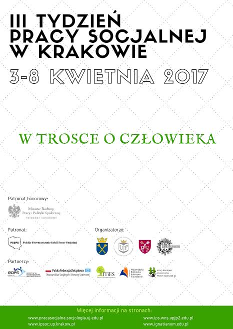 III Tydzień Pracy Socjalnej organizowany przez cztery krakowskie uczelnie (UJ, AI, UPJPII, UP) odbędzie się w dniach 3-8 kwietnia. A już dziś w ramach tego wydarzenia zapraszamy pracowników socjalnych, studentów i związkowców do zgłaszania uczestnictwa w panelu dyskusyjnym dotyczącym stosowanej przemocy wobec pracowników socjalnych w instytucjach ich zatrudniających.