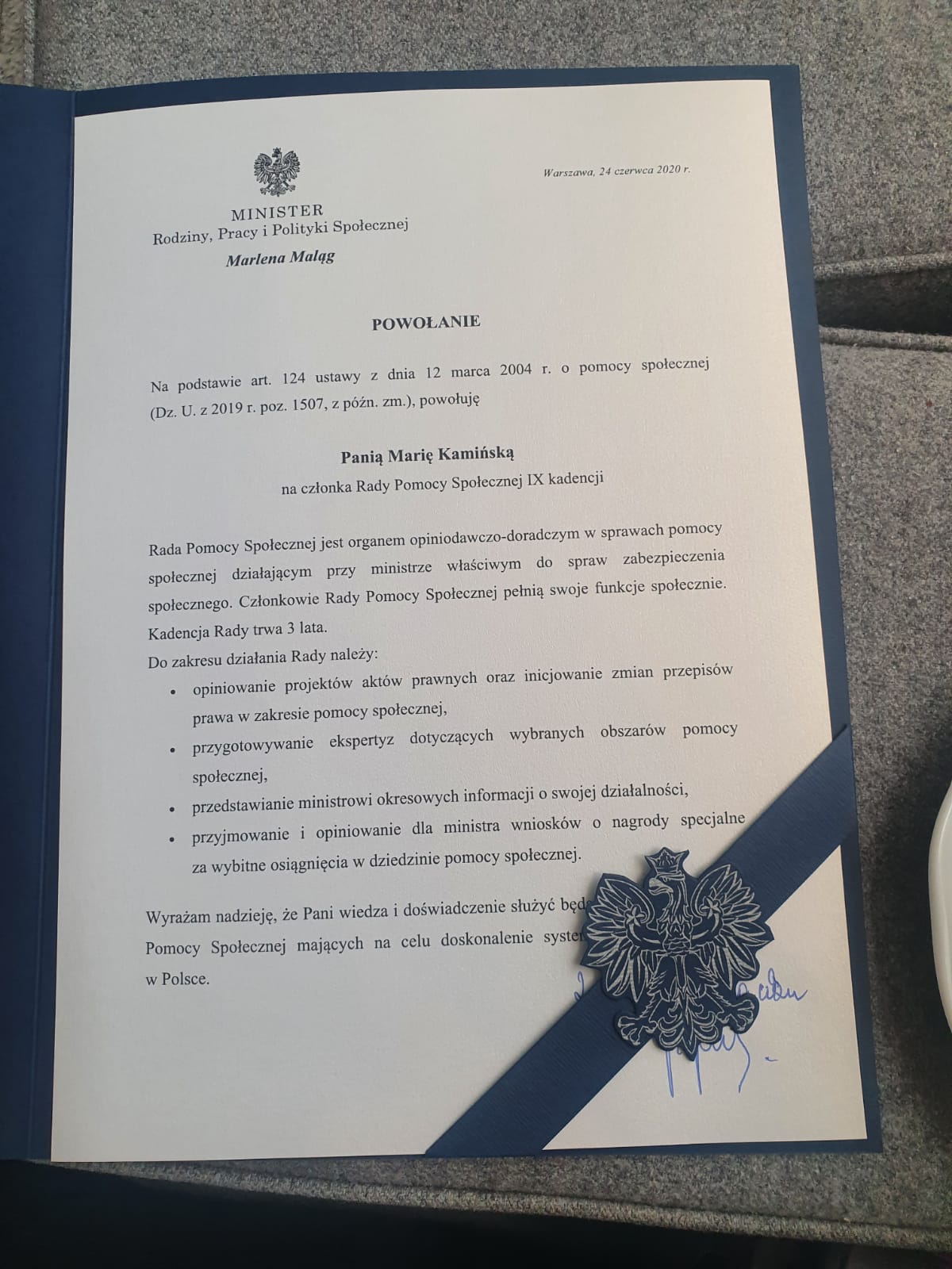 Maria Kamińska - sekretarz Federacji i przewodnicząca Związku Zawodowego Pracowników MOPR w Opolu otrzymała z rąk wiceminister Rodziny, Pracy i Polityki Społecznej nominację do Rady Pomocy Społecznej IX Kadencji. Rada stanowi organ opiniujący i doradczy Ministra. Serdecznie gratulujemy wyróżnienia, tym bardziej że nasza koleżanka będzie jedynym pracownikiem socjalnym w ww. gronie.