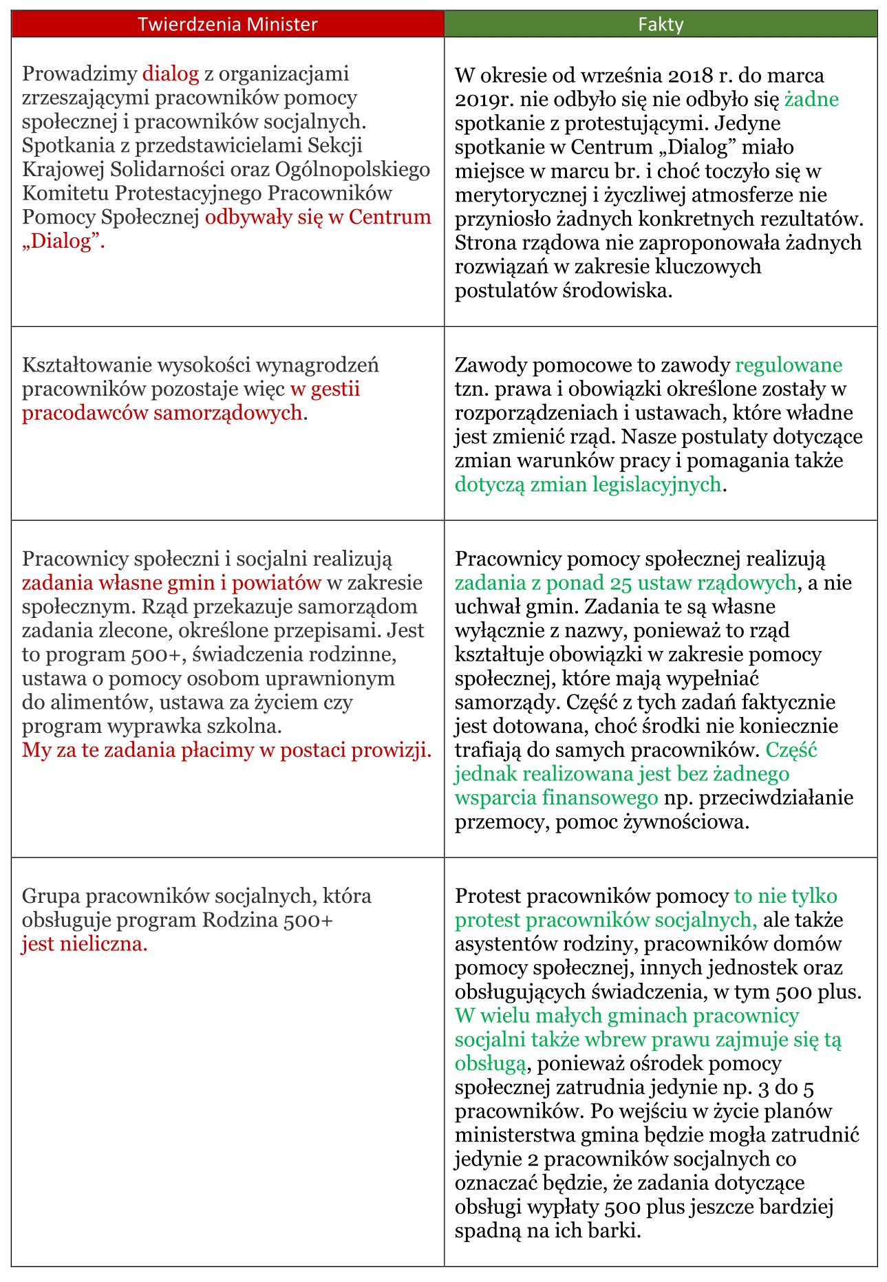 Minister Elżbieta Rafalska w wywiadzie udzielonym serwisowi wPolityce.pl potwierdza, że pracownicy pomocy społecznej i pracownicy socjalni to niezwykle ważna społecznie grupa zawodowa, która jest słabo wynagradzana. Dodaje jednak, że kształtowanie wyngrodzeń pracowników pozostaje w gestii samorządów, a grożbę opóźnień w wypłacie świadczeń rodzinnych kwituje sugestią, że protest dotyczy wyłącznie pracowników socjalnych, z których jedynie 200 zajmuje się w Polsce obsługą programu.