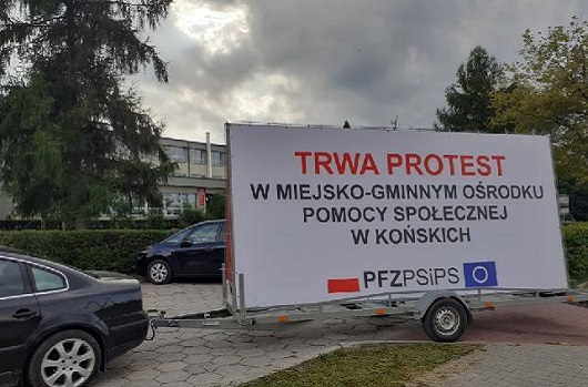 Trwa akcja protestacyjna w Końskich, gdzie Federacja toczy równolegle dwa spory zbiorowe m.in. w zakresie podwyższenia wynagrodzeń wszystkich pracowników MGOPS, wprowadzenia procedury antymobbingowej gwarantującej efektywne działania powstrzymujące mobbing, a także wypłaty ekwiwalentu za używanie własnej odzieży i obuwia roboczego. Ponownie, ale tym razem przez kilka dni, na ulice Końskich wyjechało nasze protestacyjne auto z billboardem informującym mieszkańców o trwającym proteście. Wszystko wskazuje jednak, że to nie ostatnia akcja tego typu, bowiem zamiast na porozumieniu, pracodawca oraz lokalny samorząd zdają się obecnie bardziej koncentrować na działaniach prawnych przeciwko Federacji i jak stwierdził wiceburmistrz Końskich na nie zostawieniu „pani dyrektor samej sobie”.