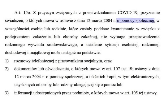 Zgłoszony przez Federację postulat dotyczący telefonicznego wywiadu środowiskowego zostanie zrealizowany w specustawie, która trafi pod obrady parlamentu. Posiedzenie Sejmu RP na odbyć się w tej sprawie już w tym tygodniu. Ustalenie sytuacji osób będzie następowało na podstawie rozmowy telefonicznej z pracownikiem socjalnym, a także na podstawie dokumentów uzyskanych elektronicznie od rodziny lub z innych żródeł na podstawie art. 105 u.p.s.